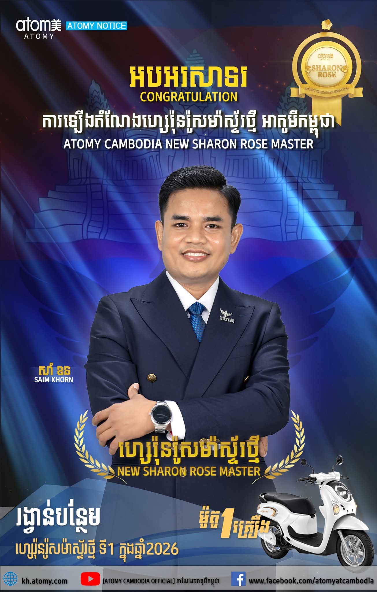 សូមចូលរួមអបអរសាទរយ៉ាងក្រៃលែងចំពោះ លោក ស៊ាំ ខន (Saim Khorn) ដែលបានសម្រេចគោលដៅដ៏អស្ចារ្យ និងក្លាយជា New Sharon Rose Master ទី១ ប្រចាំឆ្នាំ២០២៦ នេះ! 🏆✨